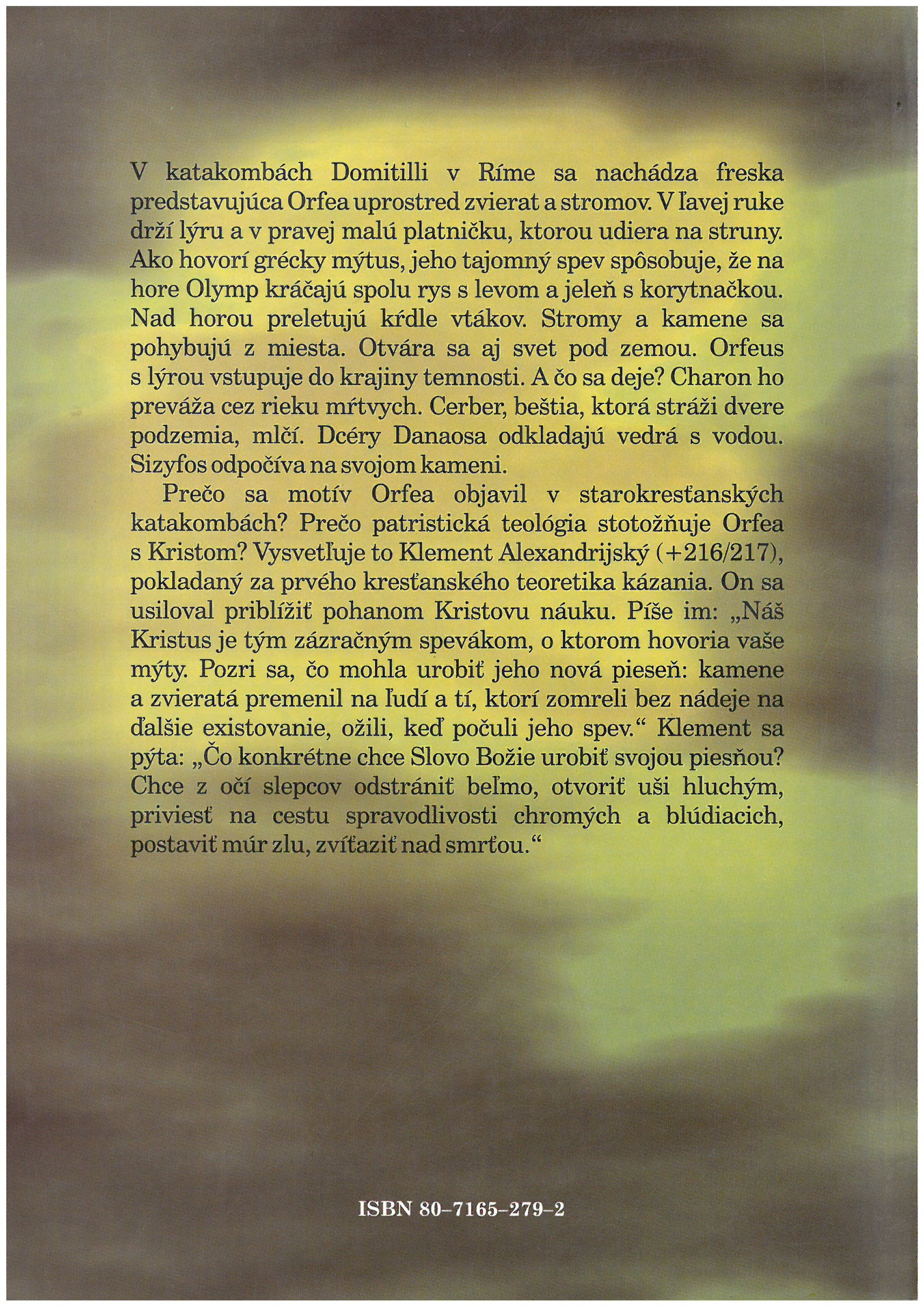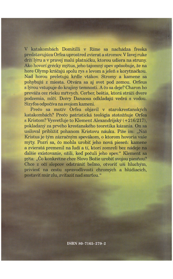 Autor vysvetľuje prostredníctvom Klementa Alexandrijského, pokladaného za prvého kresťanského teoretika kázania, prečo sa motív Orfera objavil v starokresťanských katakombách, prečo patristická teológia stotožňuje Orfea s Kristom.