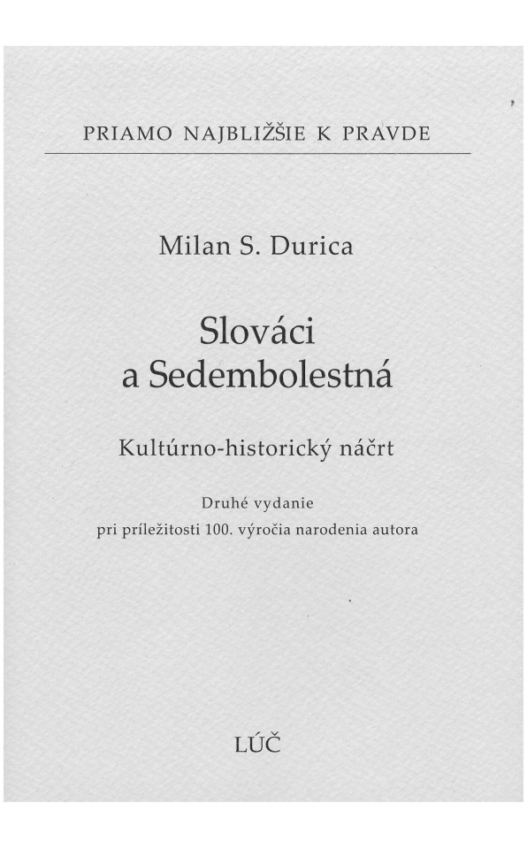 Máme bezpečné historické dokumenty o tom, že osobitnú zbožnosť a úctu k Panne Márii prejavovali naši dávni predkovia už od prvopočiatkov nášho národného bytia, ktorého vznik a vývin bol podstatne podmienený práve prijatím kresťanstva. Publikácia obsahuje konkrétne letopočty, miesta a formy vývinu a rozvíjania sa úcty k Sedembolestnej Panne Márii na území Slovenka až do dnešných dní.