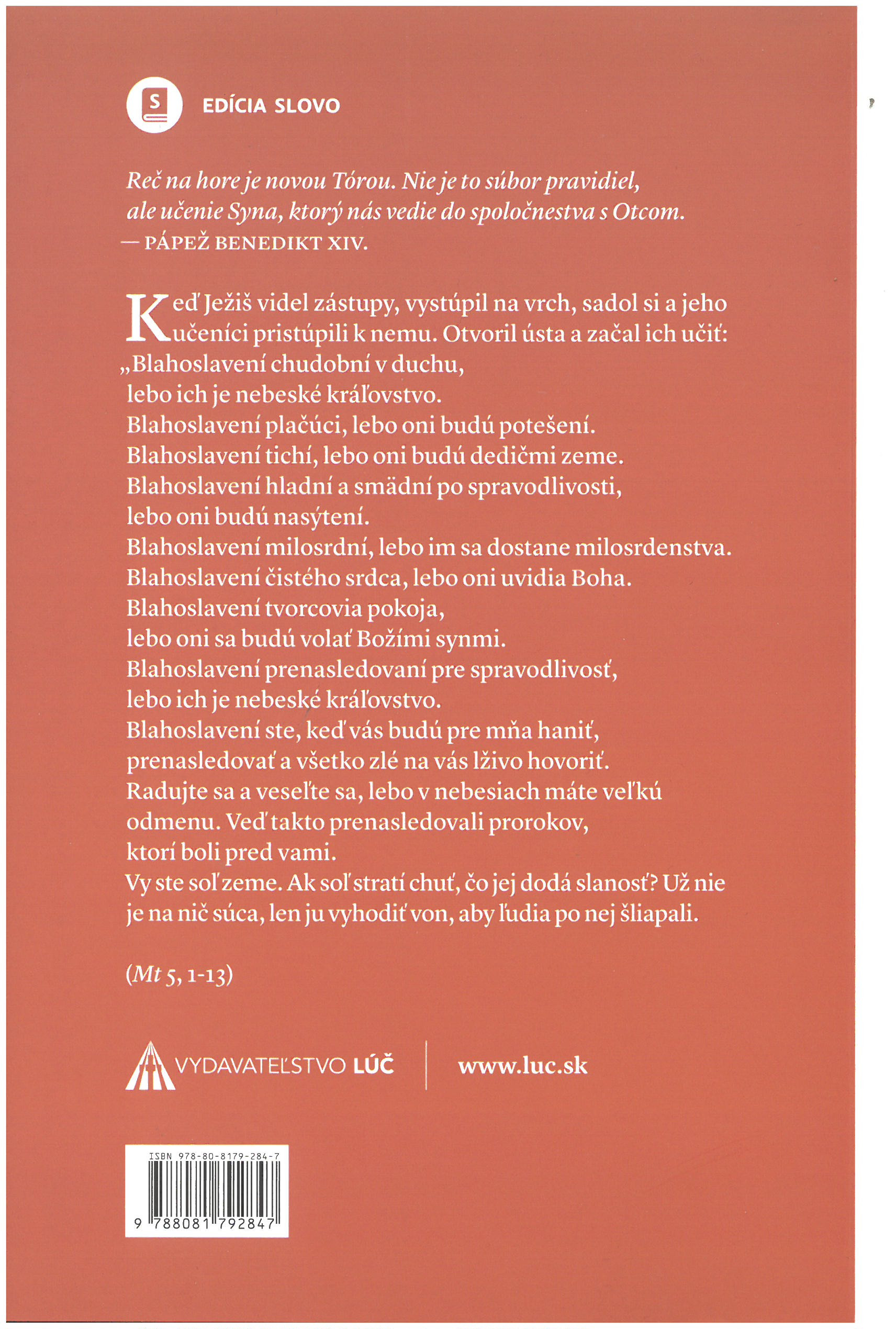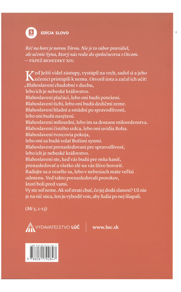 Reč na vrchu je prvou z piatich veľkých Ježišových kázní, ktoré zaznamenal Matúš. Je prvou nielen preto, že zaujíma prvé miesto, ale aj pre svoju jedinečnú a výnimočnú hodnotu. Sila jej obsahu a umenie jej skladby z nej robia perlu Evanjelia, klenot kresťanskej viery. Tento titul Vám pomôže preniknúť do jej pravého významu.