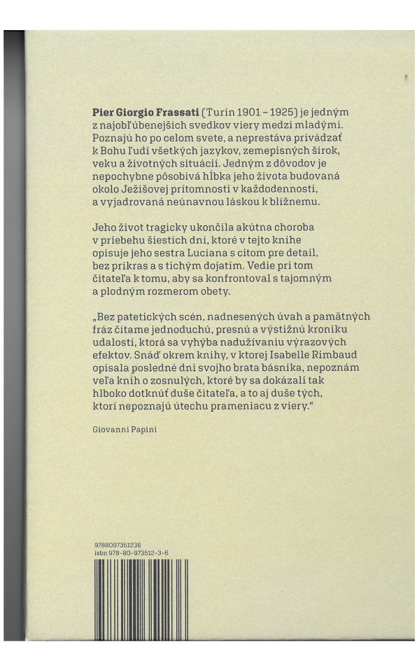 „Detailné, trpezlivé a dojímavé rozprávanie Luciany Frassati, jeho vernej sestry, nám teraz, po mnohých rokoch, sprítomňuje ten krutý týždeň osamelej a mlčanlivej úzkosti. Zviera pri ňom srdce. Bez patetických scén, nadnesených úvah a pamätných fráz čítame jednoduchú, presnú a výstižnú kroniku udalostí, ktorá sa vyhýba nadužívaniu výrazových efektov. Snáď okrem knihy, v ktorej Isabelle Rimbaud opísala posledné dni svojho brata básnika, nepoznám veľa kníh o zosnulých, ktoré by sa dokázali tak hlboko dotknúť duše čitateľa, a to aj duše tých, ktorí nepoznajú útechu prameniacu z viery.“ – Giovanni Papini